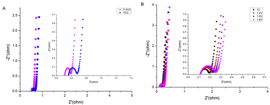 (A) Nyquist plots of the P-PCG and PCG electrodes in the frequency range 0.01–100 kHz; (B) Nyquist plots of the P-PCG electrode at various cut-off voltages.