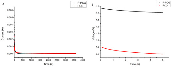 The leakages current and self-discharge were measured as shown in Figure 8A,B. The main function of leakage current tests is to measure the insulation performance of supercapacitors. Leakage current is mainly caused by the following three aspects: microelectrochemical cell current is caused by impurities in electrodes or electrolytes; potential gradient and ion concentration difference give rise to charge diffusion current in double layer; diaphragm punctured by cell burr or collector can lead to micro-short circuit current. As shown in Figure 8A, the leakage current of P-PCG is higher than that of PCG at first, but the decreasing rate of leakage current of P-PCG is extremely fast, after around 100 s, the curves of leakage current maintain stable and the value of PCG is higher than that of P-PCG, indicating the insulation performance of P-PCG is better. The main purpose of self-discharge tests is to measure the ability of supercapacitors to store charge for a long time. The following method was used to measure self-discharge in this paper. After the leakage current tests of the supercapacitors were completed, the supercapacitors was stationed for 5 h, and then the maintained voltages of the supercapacitors were measured. As shown in Figure 8B, the voltage drop rate of PCG is very faster compared with that of P-PCG, which indicates the voltage loss of PCG is larger in contrast to that of P-PCG.