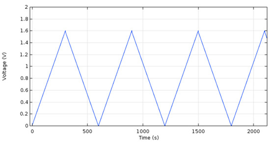 The galvanostatic charge–discharge of the model of supercapacitor with 1.5 A current at room temperature 298.15 K was carried out by simulation. The variation of voltage with time is shown in Figure 10.