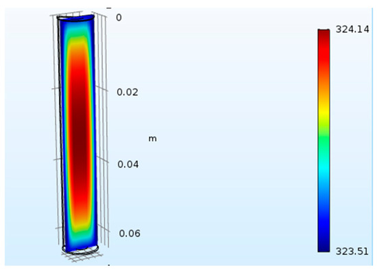 Figure 11 shows the internal temperature distribution of the model of supercapacitor after the sixtieth cycle of charge and discharge. We can observe changes in color temperature contours, in which different colors are used to represent the different temperature field. The temperature increases gradually from blue to red field.