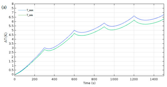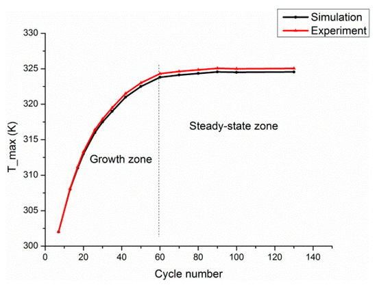 Further to explore the change regulation of internal maximum temperature with the number of cycles, simulation and experiments were carried out respectively. The two curves can be divided into two stages in general: the temperature rising stage and the steady-state stage, as shown in Figure 12.