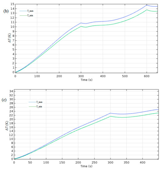 (a) The curves of temperature change at current of 5 A; (b) The curves of temperature change at current of 10 A; (c) The curves of temperature change at current of 15 A.