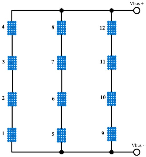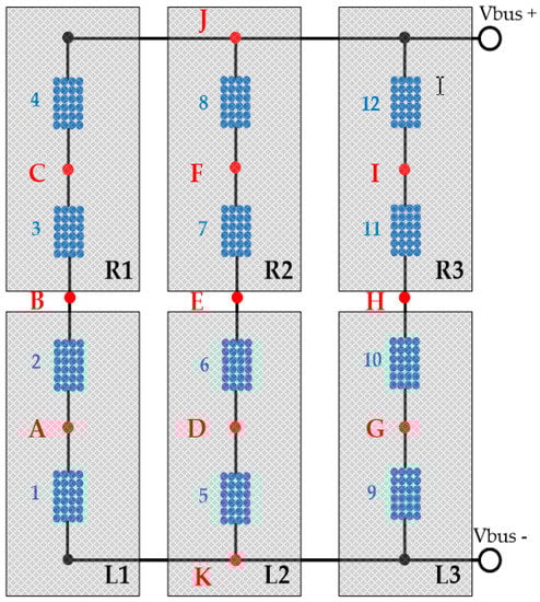 - Figure 2 illustrates a 4 × 3 series-parallel module array used for testing. Each of the 12 modules in the PV module array is assigned a code from 1 to 12 for identifying abnormal modules during detection. Subsequently, the arrays are divided into six regions, namely L1, L2, L3, R1, R2, and R3 (as shown in Figure 3), and each voltage node between the modules is assigned a code from A to K.