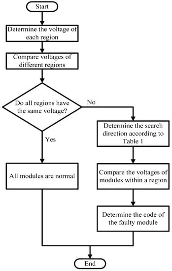 - The voltages of modules within the region involving potential faults are compared; the module with a relatively low voltage is considered abnormal. If the search direction covers more than two regions, the voltages of the modules in each region are directly compared, and the module with a lower voltage is considered faulty. The flow chart of the binary search algorithm is shown in Figure 4.