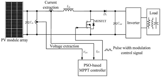MPPT is conducted using PSO because it can overcome the problem of multi-peak P–V curves. This problem occurs under failure or shading conditions and can prevent the detection of the actual MPP []. Figure 5 shows the framework of the PSO-based MPPT system.