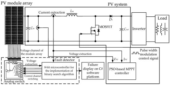 Thus, to ameliorate the aforementioned deficiencies, this paper proposes a PV module fault diagnosis system that is based on a binary search algorithm []. This system accurately locates faulty modules and also requires only a low number of voltage sensors; thus, it has a low construction cost.