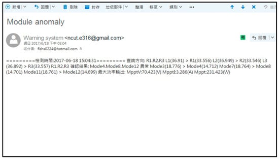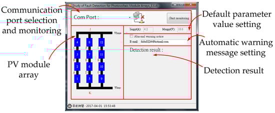 Figure 7 depicts the interface of fault diagnosis software developed using Visual C#. Users should select the appropriate communication port before initiating a monitoring process; after this selection, the detection result is displayed in the detection result section. If a module failure occurs in the PV module array, the color of the faulty module turns from blue to pink to notify the user (Figure 8). In addition, the system automatically sends the detection result to the user through e-mail if the automatic alert box is checked and the user provides an e-mail address in advance (Figure 9).