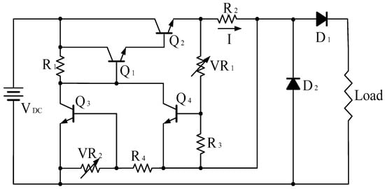 The SANYO HIP-2717 PV module simulator can be set for shading and fault conditions. Figure 10 illustrates the circuit framework of the simulator. The value of the open-circuit voltage and short-circuit current of the simulator can be adjusted to reflect the electrical characteristics of various shade conditions. In the simulator, shading was set to 0% and 30%. Figure 11 and Figure 12 present comparisons of I–V and P–V curves measured by the EKO MP-170 I–V checker and those plotted using the Solar Pro simulation module at an irradiance of 1000 W/m2 (0% shading) and 700 W/m2 (30% shading), respectively. The characteristic curve of the proposed simulator is shown to conform to the characteristics of the SANYO HIP-2717 module. Based on the analysis in Reference [], it can be seen that the open-circuit voltageof the module at normal operation and shaded condition are calculated in a different way. Therefore, the characteristics of I-V and P-V curves will be different under normal operation and shading conditions. This will result in underestimation at 0% shading and overestimation at 30% shading. However, the curve trends of the simulator are consistent with that of a real photovoltaic module.