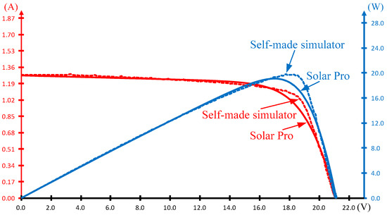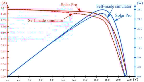 I-V and P-V characteristic curves of Solar Pro simulation and self-made simulator under 0% shading.