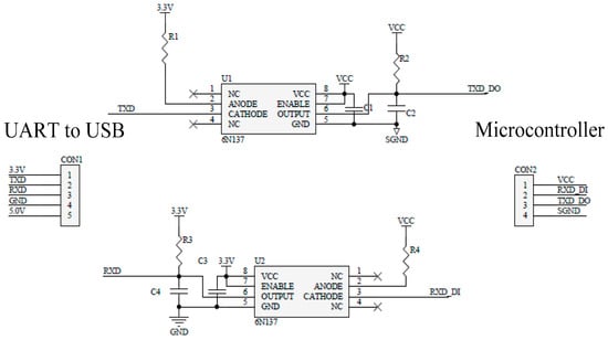 The adopted microcontroller uses a universal asynchronous receiver–transmitter (UART) as the channel for information output, transmitting the measured data to the personal computer (PC) terminal for subsequent processing. However, the PC only has a USB serial port and cannot directly link with the UART interface of the microcontroller. Therefore, a signal conversion tool, namely PL2303, is required to serve as the conversion interface between UART and USB. Figure 13 shows the signal conversion relationship. The direct current voltage ranges of the PC and microcontroller terminals are dissimilar. Therefore, because of safety considerations, an isolation system is necessary during signal conversion between the two. Figure 14 illustrates a self-designed isolation circuit that contains a high-speed optical coupler (6N137) for signal isolation during conversion.