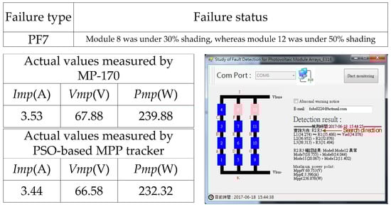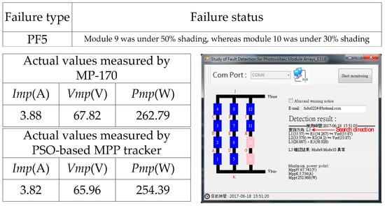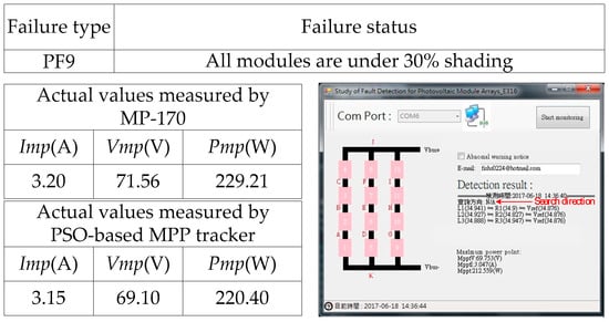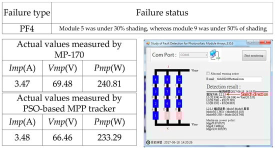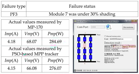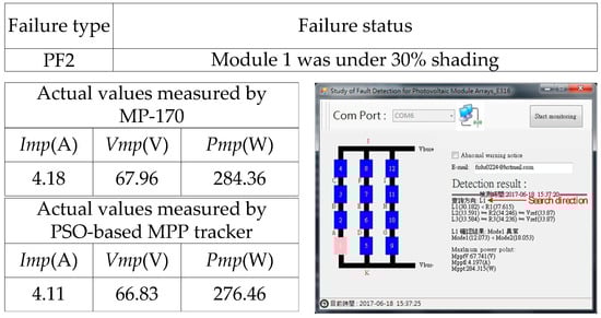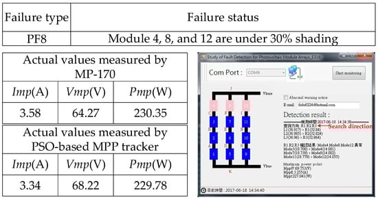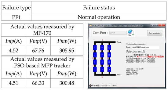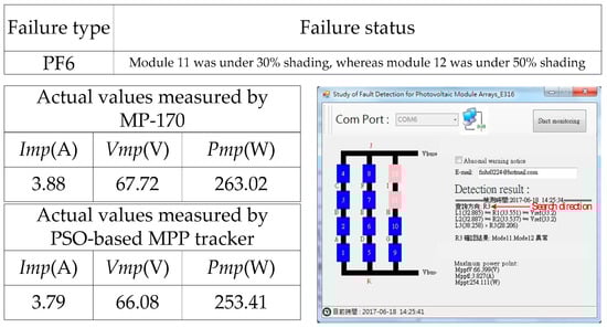 The modules of the self-made PV simulator were arranged in a 4 × 3 series-parallel configuration to form a PV module array that can adjust shading proportions and failure conditions (Figure 15). The module array applied the PSO algorithm to conduct MPPT; thus, the PV module array operated at MPP. Subsequently, the voltage values of the related nodes in the array were extracted for fault diagnosis using the proposed fault detector. Through the communication interface, the test results were exported to the software platform developed, using Visual C# for display. The proposed software can not only accurately detect the faulty module but also provide a schematic of the module array, with the color of the faulty module being converted from blue (the original color) to pink. Such a display system enables a direct interpretation of the results. Moreover, the failure types were further divided into 14 possible states as shown in Table 1. The experimental outcomes of these nine failure types are shown in Figure 16, Figure 17, Figure 18, Figure 19, Figure 20, Figure 21, Figure 22, Figure 23 and Figure 24, respectively. The results indicate that the proposed fault detector can accurately locate faulty modules and let the PV module array operate at MPP.