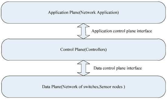 SDN came into being, control and forwarding separation features provide effective way for WSN routing algorithms. As shown in Figure 1, SDN−based network architecture will be more flexible, and application upgrades will be more simplified.