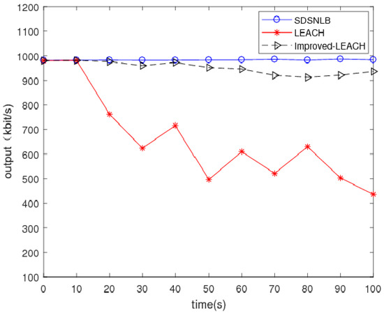 Figure 4 shows the experimental results of the data flow under three different algorithms. As can be seen from the figure, when the conventional LEACH protocol algorithm is used, in a period of 0 to 10 s, the data flow in the network is relatively simple. Therefore, the effective throughput of the data stream is close to the uplink rate. And after 10 s, as the data traffic increases, the effective throughput of the data stream is significantly reduced. For the improved LEACH algorithm, the effective throughput of the data stream is close to the uplink rate from 0 to 20 s, and after 20 s, the effective throughput decreases. When using the SDSNLB algorithm, the effective throughput of the data stream approaches the uplink rate in 0 to 100 s.