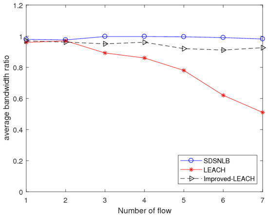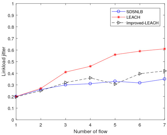 In order to better demonstrate the effectiveness of the improved algorithm, the SDSNLB algorithm, the LEACH and improved LEACH protocol algorithm were compared and simulated. The LEACH protocol is a classic clustering-based routing protocol proposed in the WSN. Despite the shortcomings, studying the basic clustering protocol LEACH can help to better understand other clustering protocols. In addition, the hierarchical organization of the LEACH protocol is suitable for the dynamic distribution of resources. The cluster head node in the cluster can be regarded as a controller, and the cluster member node can be regarded as a node user, thereby better performing simulation. The improved LEACH algorithm is designed to extend network lifetime and improve efficient data transmission through balanced elections. The main analysis and comparison of the three algorithms on the network node link bandwidth utilization, network throughput, and network jitter.