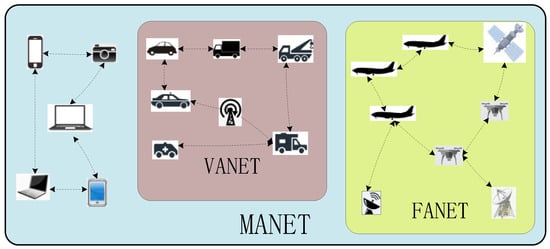 Mobility is one of the most prominent features of mobile ad hoc networks (MANETs) and one of the important factors affecting network performance. Being a typical subset of MANETs, the node mobility in flying ad hoc networks (FANETs) [1,2,3] is stronger and severely impacts the network performance (Figure 1).