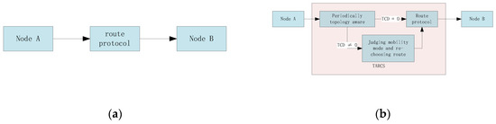 Communication mode comparison between two nodes without and with the topology change aware routing protocol choosing scheme (TARCS). (a) Traditional communication mode between nodes without the TARCS; (b) communication mode between nodes with the TARCS.