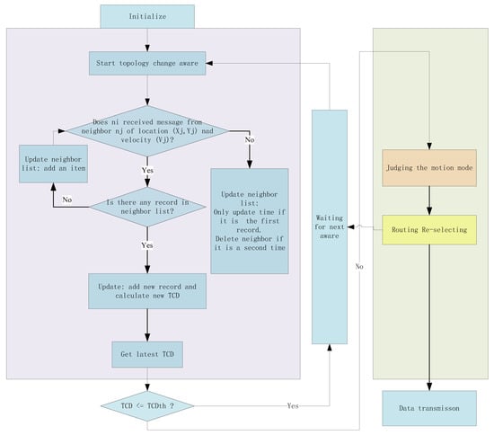 Figure 4 shows the basic workflow of the TARCS. The TARCS is divided into two phases. The left region represents the periodic topology change aware (PTCA), and the right region represents the adaptive routing protocol selection (ARCS).