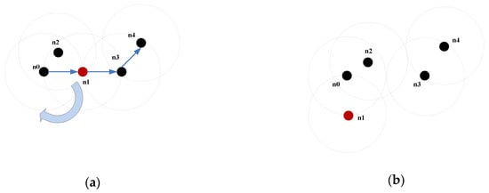 Figure 6 shows the topology change caused by changes in the direction of movement between nodes. Figure 6a is the initial state. From this moment on, n0 will move around n1. After time T, the distance between n0 and n1 is still the same. However, there is no effective path between n0 and n4 due to the change of direction between n1 and n0. As is shown in Figure 6b. It can be seen that changes in the direction of movement of nodes can also cause topology changes.