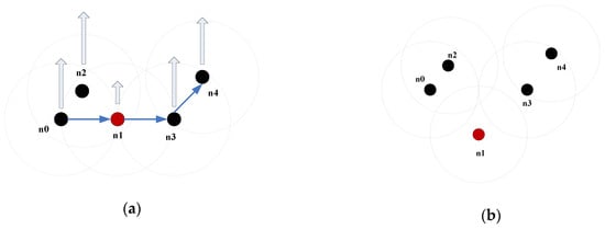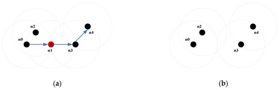 Figure 5 shows the topology change caused by the change in distance among nodes. Black dots and red dots represent moving nodes, and dashed circles indicate the effective transmission range of nodes. Figure 5a shows the topology in the initial state. Nodes n1 and n2 are within one hop of n0. Node n3 is within one hop of n1, and n4 is within one hop of n3. Node n0 establishes a route through n1, n3, and n4. From this moment on, n1 starts moving down. Figure 5b shows the network topology after time T. At this time, n1 has moved out of the effective range of n0, and the distance between n0 and n1 increases. If n0 still sends data to n4, it can only pass the path: . It can be seen that topology changes could be caused by distance changes between nodes.