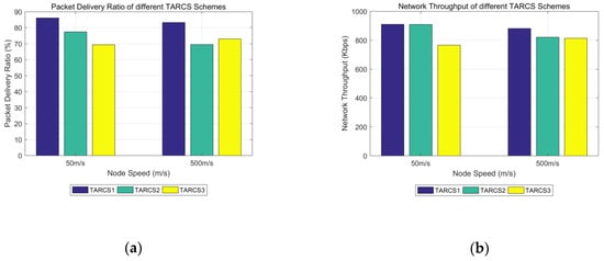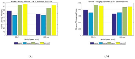 It can be seen from Figure 9a that when node speed is 500 m/s, the packet delivery ratio is 58.9435% only with OLSR, 55.4443% only with DSDV, 74.9448% only with AODV, and rises to 83.3388% with the TARCS.