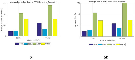 Figure 9c shows the average end-to-end delay comparison. Regardless of the rate, the average end-to-end delay is different from the first two performance metrics. Using the TARCS strategy chosen for this experiment, the average end-to-end delay of the network is not the smallest, but between the highest 0.141 s (AODV) and the lowest 0.032 s (DSDV), and is also higher than the OLSR of 0.06 s with the node speed of 500 m/s.