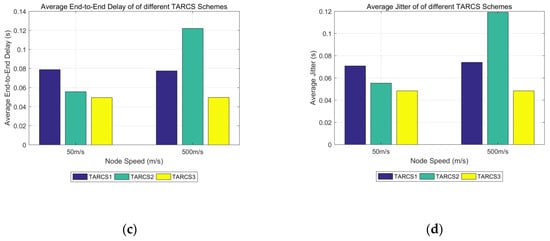 When the node speed is increased to 500 m/s, the packet delivery ratio of TARCS1 is the highest (sorted in descending order: TARCS1 83.3388%; TARCS3 73.0154%; and TARCS2 69.5115%). The network throughput of TARCS1 is also the highest of the three (sorted in descending order: TARCS1, 881.438 Kbps; TARCS2, 821.2191 Kbps; and TARCS3, 813.157 Kbps). Yet, in terms of average end-to-end delay, TARCS3 has the lowest value (sorted in ascending order: TARCS3, 0.04968 s, TARCS1, 0.07751 s; and TARCS2, 0.1221 s). The average jitter of TARCS3 is also the lowest (sorted in ascending order: TARCS3, 0.04838s; TARCS1, 0.07397 s; and TARCS2, 0.1192 s). None of the network performances is effectively improved by TARCS2.