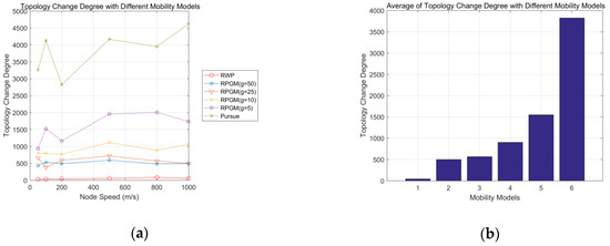Comparisons of topology change degree values with different mobility patterns: (a) TCDntwrk; (b) the average of TCDntwrk (1-RWP, 2-RPGM (g = 50), 3-RPGM (g = 25), 4-RPGM (g = 10), 5-RPGM (g = 5), 6-Pursue).