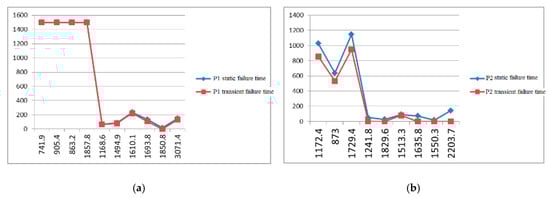 (a) Comparison of the number of first transient failure times at different points, (b) Comparison of the number of static failure times at different points.