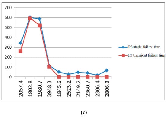 (a) P1 first transient, static failure comparison chart, (b) P2 first transient, static failure comparison chart, (c) P3 first transient, static failure comparison chart.