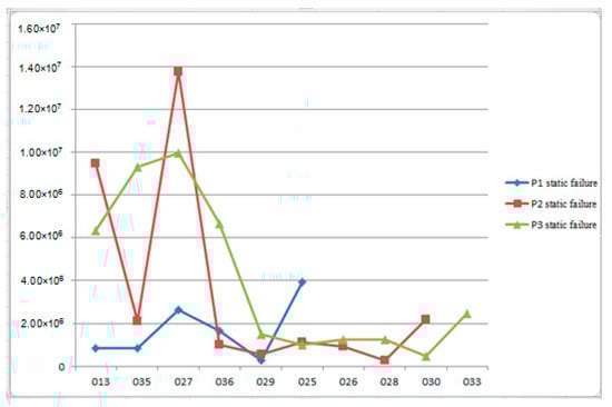Figure 7 shows comparison of numbers of first time transient and static failures for the P1, P2, and P3, where the abscissa coordinate is the strain, the vertical coordinate is the failure times. The number of first transient failures and the number of first static failures decrease gradually with the increase of strain at the same point. When the transient failure occurs about 10 to 100 times, the static failure occurs. That is, when a certain amount of cracks occurs, the stress concentrations at the crack cause the crack propagation rate to be high, leading to the formation of large cracks, which leads to the failure of the solder joints.