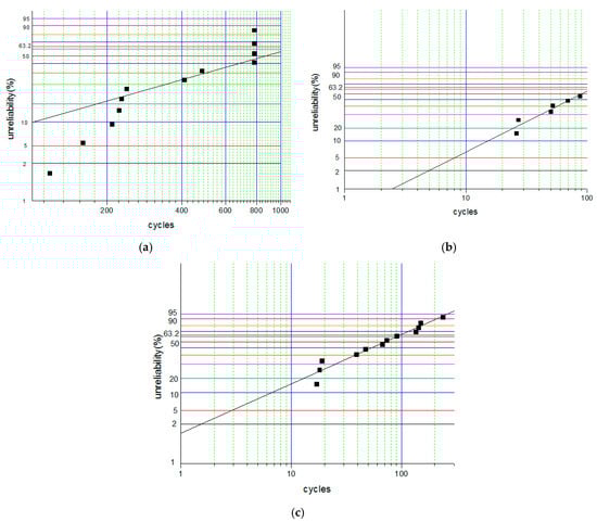(a) Relationship chart of board failure rate and life under B test condition, (b) relationship chart of board failure rate and life under H test condition, (c) relationship chart of board failure rate and life under G test condition.