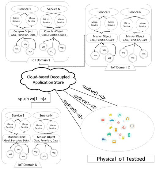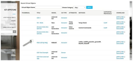 Some efforts have already been made for standardising virtual objects across different IoT applications. The work in [23,24,25,26] are worth mentioning. As a common point, a virtual object must have a unique representation (ID), describe the data about the object (properties) and behaviour of the object (methods). In some cases, an object can have an executable file that is a skeleton code on how to simulate the behaviour of the virtual object using the object data. Keeping in mind the above-mentioned challenges and facilitating the open-source makers’ community, this paper presents the idea of a decoupled application store, which serves a cloud-centric central place for virtual objects. These virtual objects can be discovered from the application store and can be used in a variety of similar IoT applications. Moreover, different IoT domains can also share their virtual objects so that they can be discovered and consumed by other applications. The application store can be thought of loosely coupled components of IoT applications which can be combined to build an IoT application.