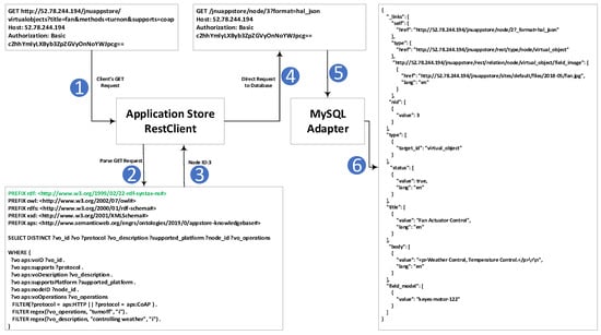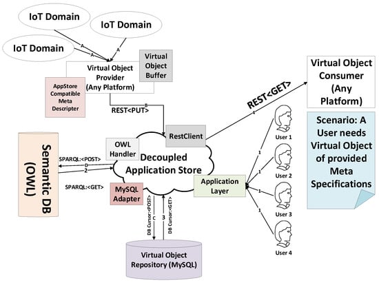 Two scenarios can be thought of for explaining the effectiveness of the proposed application store. First, an IoT technology tinkerer, who aims at integrating different objects to form an IoT service, will search the required virtual objects in the store. The application layer of the store will take a user query for the virtual object. The query contains the meta description of the virtual objects. The application layer passes the received information to the OWL handler module which in turn posts a SPARQL-based query to search the virtual objects against user-supplied metadata in the Semantic database. Once, the virtual object is found, the semantic database returns the reference of the virtual object which has been stored in the virtual object repository database. MySQL adapter module uses the reference to retrieve the virtual object and delivers it to the application layer or RestClient module in case the user requires a headless response. These operations are numbered as 1, 2, 3, 4 in Figure 2.