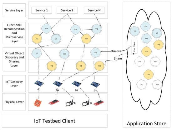 As part of the system architecture, an IoT Testbed Client is implemented for assessing the usefulness of the proposed system. The testbed is discovering virtual objects from the application store and sharing specialized virtual objects for open-source IoT makers. The testbed is communicating with the application store using RESTful web services. The architecture of the testbed is illustrated in Figure 3. The testbed is a layered architecture and has different layers for defined roles. The top layer is a service layer which deals with services offered by the platform so that end users can consume them. The following layer is the functional decomposition and microservice layer. This layer receives a virtual object, decomposes it into the form of functional blocks and maps them to form a microservice. In other research, it is also called composite virtual objects [31,32]. A layer underneath is virtual object discovery and sharing layer. This layer has two sublayers; both of which is communicating with API exposed by the application store. The virtual object discovery layer finds and discovers virtual objects according to application requirements and the sharing layer shares the customized virtual objects to the application store for the use of open-source makers community. Each virtual object is registered with a gateway which is the job of the gateway layer. Virtual objects are registered and mapped onto the actual physical hardware. The last layer is the physical layer which deals with the deployment of virtual objects on physical corresponding devices.