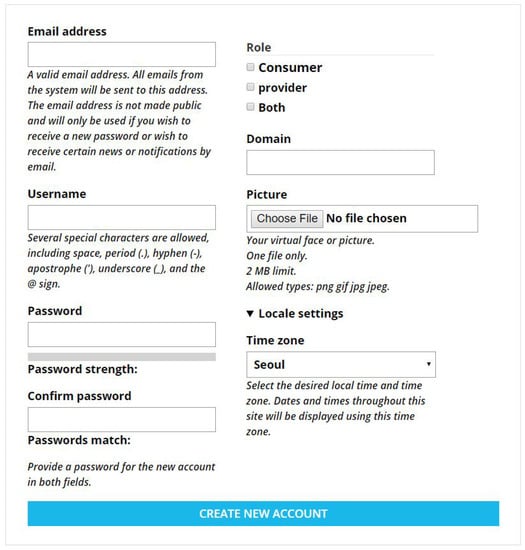 Registration is the main module through which application users can get access to the resources on the application store. Users can be registered with the role of consumer, provider or they can opt for both. At the time of registration information like IoT domain, time zone and email address are received. The administrator receives the registration request and approves it, and the new user is notified via email. A sample web form is shown in Figure 4.