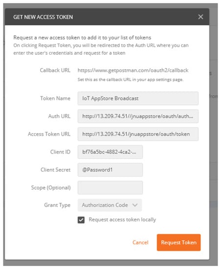 The registered clients got the access code from the authorization server which grants access to protected resources on the application store. The client makes a request using OAuth2 protocol to the authorization server by providing parameters like client UUID, secret, authorization server URL, access token URL, and callback URL. Access token URL is where the token is posted, and the authorization server URL is the address of the authorization server which identifies clients and validates them using the provided UUID and secret. A sample postman-based test request is shown in Figure 5.