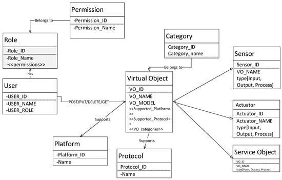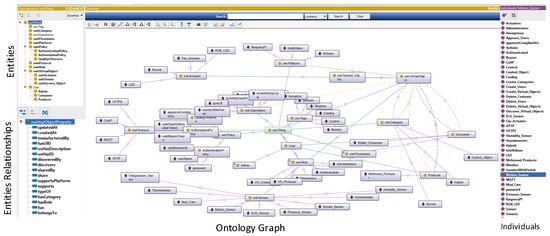 In this paper, a semantic approach has been used to store and conceptualize virtual objects’ descriptions and their relationship with other entities. The information model is based on OWL ontology, and the discovery is made possible using SPARQL, a standard query language for querying and traversing semantic graphs. It has been argued in many literature studies [33,34,35] that an IoT application should be semantically modeled in terms of ontologies which define common knowledge base of a particular IoT domain. IoT applications deal with physical devices of heterogeneous nature, so some of the preliminary requirements of IoT application mentioned in the early design of IoT systems are interoperability and support of diverse platforms [36,37]. Therefore, the semantic representation of information is of paramount importance in the IoT domain due to the inherent comfort of interoperability. Semantic representation also makes IoT applications easily discoverable due to the uniformity of the documents’ structure. We use Protégé editor [38] for visualising ontologies and Apache Jena API [39] for interacting with the application store. The ontology graph based on Protégé editor is depicted in Figure 6. As shown, OWL classes such as owl:VirtualObects, owl:Permission, owl:Platform and others are defined along with their relationship and domain of their attributes. For instance, it has been shown that for the operation sharing, the policy of authorization and authentication must be ensured. In semantic modeling of knowledge, certain known facts are manually created which are also known as asserted facts. On the other hand, some facts are inferred using the asserted facts. For instance, the following facts