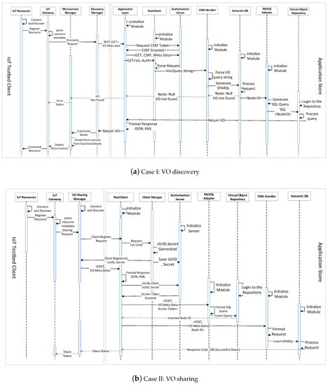 The second scenario is for sharing virtual objects. Different IoT domains share virtual objects in standards compliant with the application store. Virtual object buffer temporarily stores the virtual objects and then passes it to meta descriptor module. The module extracts meta-data information from the virtual objects and uses RestClient module to put the request. The request is parsed, and the equivalent SQL query is generated by MySQL adapter which persists the virtual object and returns the unique identification of the newly-added virtual object. The OWL Handler uses the identification reference along with the data to generate a SPARQL-based post operation to post the meta-data and the reference into the semantic database. The sequence of operations in the second scenario is labeled as A, B, C and D in Figure 2.