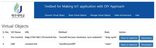 The user intending to discover virtual objects starts with the adding virtual object to the client system. In the virtual object discovery interface, there was an option to discover virtual objects on the application store considering the user is already connected and authorized. If the virtual object meets the device profile meta-information supplied by the user, the interface was pre-populated, and the virtual object was pulled using the RESTful GET method. The discovered virtual object was added after making some application-specific modifications. The virtual object listing interface listed down all the virtual objects added into the database as shown in Figure 15. For each virtual object, the action column provided a couple of buttons to decompose it into functional blocks and also to share application-specific ones on the application store. In Figure 17, we have considered a case where the user needs a virtual object for the fan controller. First, he connects with the application store and provides meta information. These include tags, data attributes, description, and operations or methods the object can potentially perform. In the second step, the virtual object was discovered and saved in the database which is shown on the virtual objects listing page. On the listing page, two actions can be performed on individual virtual objects; sharing to the application store and decomposing it into functional blocks. In the case, if the decompose action is triggered, the application comes up with an interface which provides a space to the makers, where the virtual objects are represented in functional blocks. The functional blocks are operations that a virtual object can potentially perform. For instance, in the case of fan control, operations like turnoff-fan, turn-clockwise, and turn-anticlock are listed. These operations are connected by dragging a line from the virtual object to the operation and dropping it on the operation block. Once the drag-and-drop is done, the configuration is persisted in the form of microservices. In the next screen, the microservices are listed with an action button to deploy them on their corresponding physical objects. Once the button is clicked, the fan control starts to perform the specified action. Consequently, the maker saves a lot of effort by otherwise writing code for virtual objects adding, configuration and connecting it. The same steps can be followed to discover sensors virtual objects and deploy them as a microservice on the specified temperature sensors. To make a simple weather control service, the microservice are deployed conditionally. For instance, the temperature sensor is deployed, and if the sensed value is greater than some threshold, only then the turnon-fan microservice is deployed.