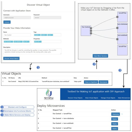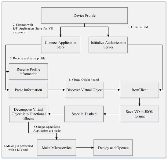 In this paper, the detailed design of intelligent weather control in the smart home, a simple-as-possible case study is presented. The application utilizes the proposed application store to discover virtual objects of temperature sensors and humidity sensors. It also uses a fan motor as a controlling actuator. The flowchart representation of the application is exhibited in Figure 16. First, the device profile is investigated from the specification document and based on the desired features, the virtual object is discovered. Once the virtual object is found, it is received in IoT testbed client. The virtual object is then configured to reflect application specific changes, i.e., changing URI, and is saved in the database. The virtual object is decomposed into functional blocks afterwards. The blocks are then drag-and-dropped using any DIY technology to compose a microservice. In this paper, we have used jsPlumb, a Javascript library to enable the drag and drop behaviour in the browser. A microservice is an operation which is performed by a physical thing. In the virtual domain, a microservice is comprised of a virtual object and an operation or a task.