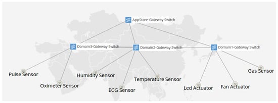 In this section, we investigate the performance analysis in terms of response time for two scenarios which have been described earlier, i.e., VO discovery and VO sharing. For this, we use Mininet tool along with ONOS as a remote controller and GUI. The topology of the network is exhibited in Figure 19. Three IoT testbed clusters are communicating with each other by sharing and discovering different virtual objects. Hosts are acting as gateways to different IoT resources. In this experiment, Pulse Sensor, Oximeter Sensor, Humidity Sensor, ECG Sensor, Temperature Sensor, and Gas Sensor were taken as sensor devices whereas Fan actuator and LED actuator are considered as actuating devices.