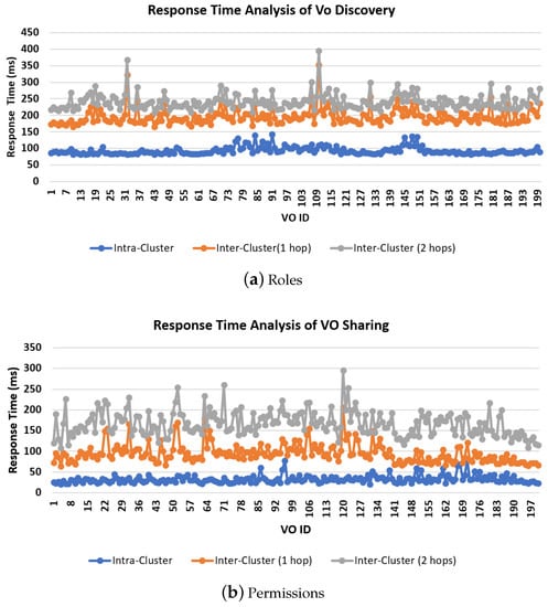 The communication nhas bee performed in three ways for both cases; first, intra-cluster communication which shares and discover virtual objects in the same cluster. Second, the closest cluster for communication and finally, the remote cluster which was at the farthest location. The response time for 200 requests is recorded for a bandwidth of 476 Mb/s and with a network latency of 10 ms. The resultant graphs are shown in Figure 20. It has been evident that the response time of intra-cluster communication was the fastest in both cases and the response time of the farthest cluster in inter-cluster communication is the slowest in both cases. It is due to the additional hops and the distance between IoT domains and application store. Overall, the response time of VO sharing is slower than the response time of VO discovery because the uplink speed is in many cases slower than the downlink speed.