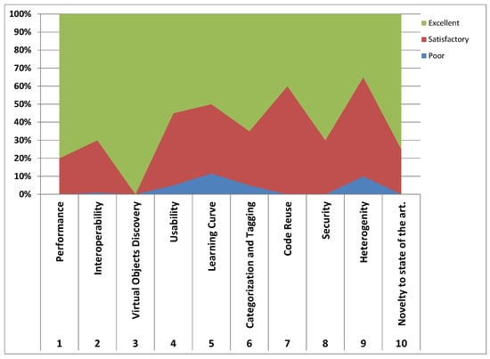 As part of the subjective testing, 20 students from the Department of Computer Engineering, Jeju National University, were given the application store source to get the necessary virtual objects for their IoT-based course projects and shared their distinct virtual objects to the application store after completing their projects. At the end of the course, a survey was conducted to find the opinion of students on various key factors of the application store. These include performance, code reusability, the usability of the application store, interoperability and many more. Their responses are recorded in either of poor, satisfactory and excellent. The result of the survey is shown in Figure 21. The green area shows the percentage of students who voted excellent for various attributes. The red area indicates a satisfactory response from students and the blue area represents a poor response.