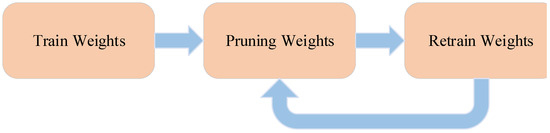 Considering that the fully connected layer is more over-parameterized and has aggressive pruning compared with the convolutional layer, our pruning strategy implements a three-step pipeline process, as illustrated in Figure 3, which starts from adjusting weights via conventional network training. The second step prunes the weights below the threshold into zeroes, converting an originally dense network into a sparse one. The final step is to retrain the remaining non-zero weights to adapt to the forced zero weights, otherwise the accuracy will be significantly affected. Such network pruning is performed iteratively layer by layer: after pruning and retraining one layer of the CNN to achieve the original accuracy, the next layer will be pruned and retrained until all layers are completely pruned.