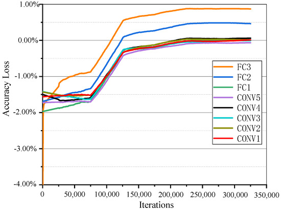 The detailed retraining process per sparse layer of AlexNet is shown in Figure 4. The y axis denotes the accuracy loss, which is relative to the top-1 accuracy 57.13% of the original model. As illustrated in Equation (1), the accuracy loss exhibits as negative values, which indicates that the accuracy after pruning and retraining does not recover the original accuracy. The x axis indicates the number of iterations. It can be seen that the classification accuracy was seriously damaged after each pruning. In addition, not all layers restore to the original accuracy after retraining. One reason is that the preceding layers for pruning should leave some redundancy for the pruning of the following layers. The other is that the latter layers use conservative pruning to compensate for the accuracy loss caused by the previous layer of aggressive pruning. For example, the retrained accuracy of FC3 and FC2 was much higher than the original value while CONV4 and CONV3 were slightly lower. Ultimately, the CONV1, represented by the red line in Figure 4, was the last retraining process, and the retrained accuracy of which was higher than the original AlexNet model.