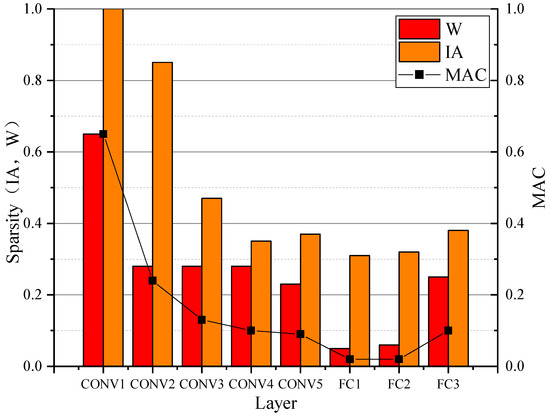 The sparsities of Weight (W) and input activation (IA) and reduction of multiplication and accumulation (MAC).