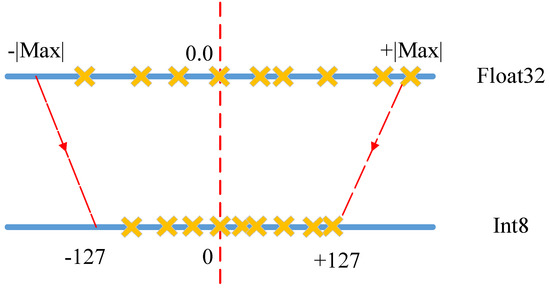 We further compressed the model by quantizing bit-width per weight from a 32-bits float point into 8-bits, making it more efficient to implement MAC operations on FPGA. That is because image processing tasks are insensitive to numerical accuracy, and FPGA is more suitable for data processing with 8-bit precision. It has been proven that quantization has very little impact on image processing [23,24]. We designed a linear maximum quantization strategy for each layer in the pruned CNN, as shown in Figure 6. The linear maximum quantization was to sort the weight range of each layer in the pruned CNN, and then take the maximum absolute value as the threshold and map the range directly to the int8 scale. It should be noted that when the positive and negative distribution was not uniform, there was a part of the vacancy, but this method maximized the original information.