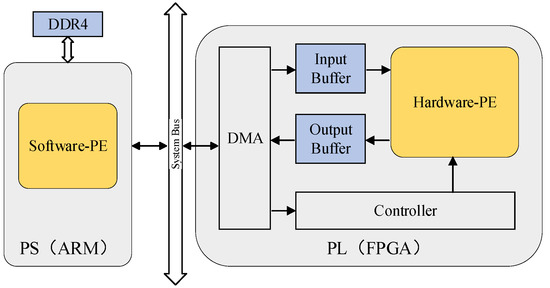 The ARM realizes data transmission of instructions and convolutional results between the FPGA and the software-PE, which accomplishes the fully connected layers and softmax function. The FPGA consists of direct memory access (DMA), controller, input buffer, output buffer, and hardware-PE. The hardware-PE takes charge of convolutional layers, pooling layers, and non-linear functions. On-chip buffers, including the input buffer and output buffer, prepare data to be computed by hardware-PE and store the result. The controller analyzes the instructions from ARM and harmonizes modules according to FPGA resources, configuring the depth of input buffer and output buffer and the number of output feature maps in parallel.