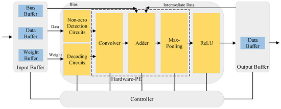 The hardware-PE takes charge of non-zero detection circuits, decoding circuits, convolutional layers, pooling layers, and the non-linear function ReLU. Figure 9 describes the detailed hardware-PE architecture and other relative modules.