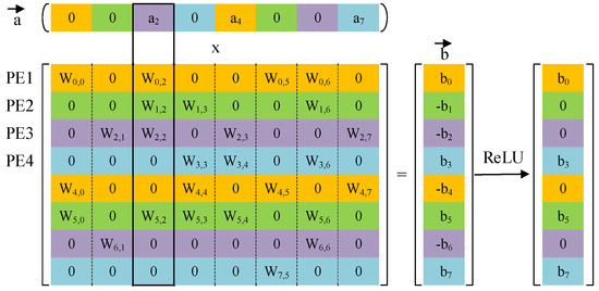 - Non-zero detection circuits were used to hierarchically broadcast the non-zero input data to each PE according to the advantage of the input activation sparsity, as shown in Figure 11. Multiplication occurred only when the input activation was a non-zero value, which greatly reduced computing resources.